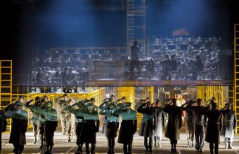 Komische Oper in Berlin in co-production with Zurich asked to Catalan director Calixto Bieito to put on stage the opera and he has set it in the Sixties, time of the Vietnam War and the Cold War. The entire orchestra, all dressed in combat gear, is on a spectacular yellow metal scaffolding set positioned at the back of the stage designed by talented designer Rebecca Ringst. The pit completely covered is the stage brought forward into the hall so that all the major action takes place in the auditorium, almost in the lap in those unfortunate enough to have selected the front row. This had disadvantages, limiting fluidity of movement and creating an almost concert-like situation but the show is really great.