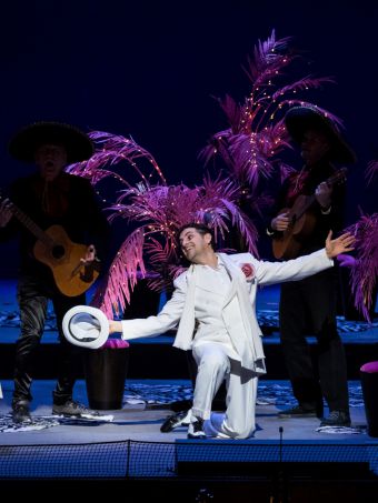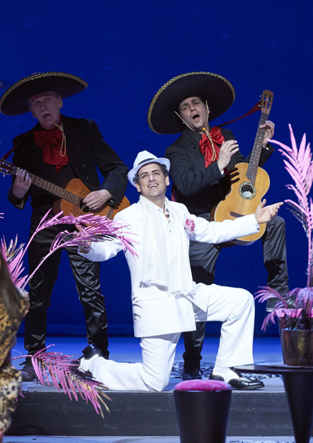 Identified with the role of Ernesto on world stages, the loved tenor Juan Diego Florez was another Ace of the night. Although his voice has deepened a little more over the years, it’s still soft, flexible and it preserves its perfection. One can notice this beauty even when he is cutting his high notes short like he is trying to protect his voice. He demonstrated his lyrical voice’s all beauties in Act 1 aria (“Sogno soave e casto”); in the poetic (“Cercherò lontana terra”) aria of Act 2 that he sang by a table, in company of the trumpet player’s (Gerhard Berndl) soulful solo – trumpet player who was on stage- and in the famous last Act aria (“Com’è gentil…”). In this last aria (“Com’è gentil”), director İrina Brook almost made a reference to the singers in the 50’s American shows who sang while dancing with their microphones: Juan Diego Florez sings his aria all the while doing pirouettes; with two “Mexicans” following him behind his back with their typical hats and guitars and with Florez’s kneeling on one knee at the end of the song, the production’s buffa element became completely emphasized.