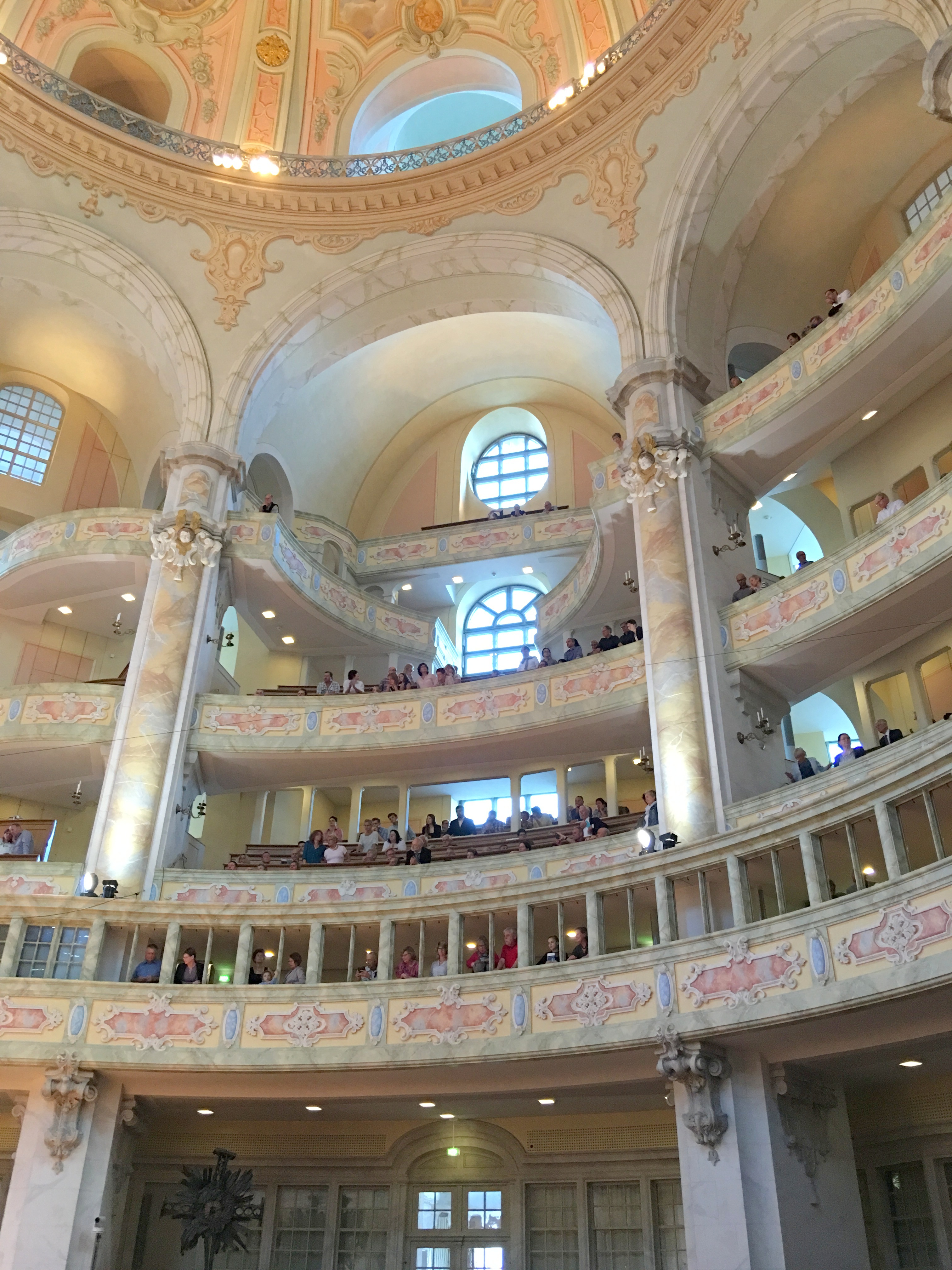 The interior of Frauenkirche, which was decorated with patterns in classical style, and glamourized with pastel colours, resembles a huge fruit cake rather than the usual church look. The fact that there are transparent glasses in the huge windows instead of stained-glass is the main factor that has an effect on the brightness of the interior. Apart from being the number one church of the city, Frauenkirche is one of the most important concert locations of the city with its 1500 seating capacity, and its warm acoustics unexpected from a stone building. It’s the reason why it feels very natural that many concerts in Dresden Music Festival are held at this monumental place.