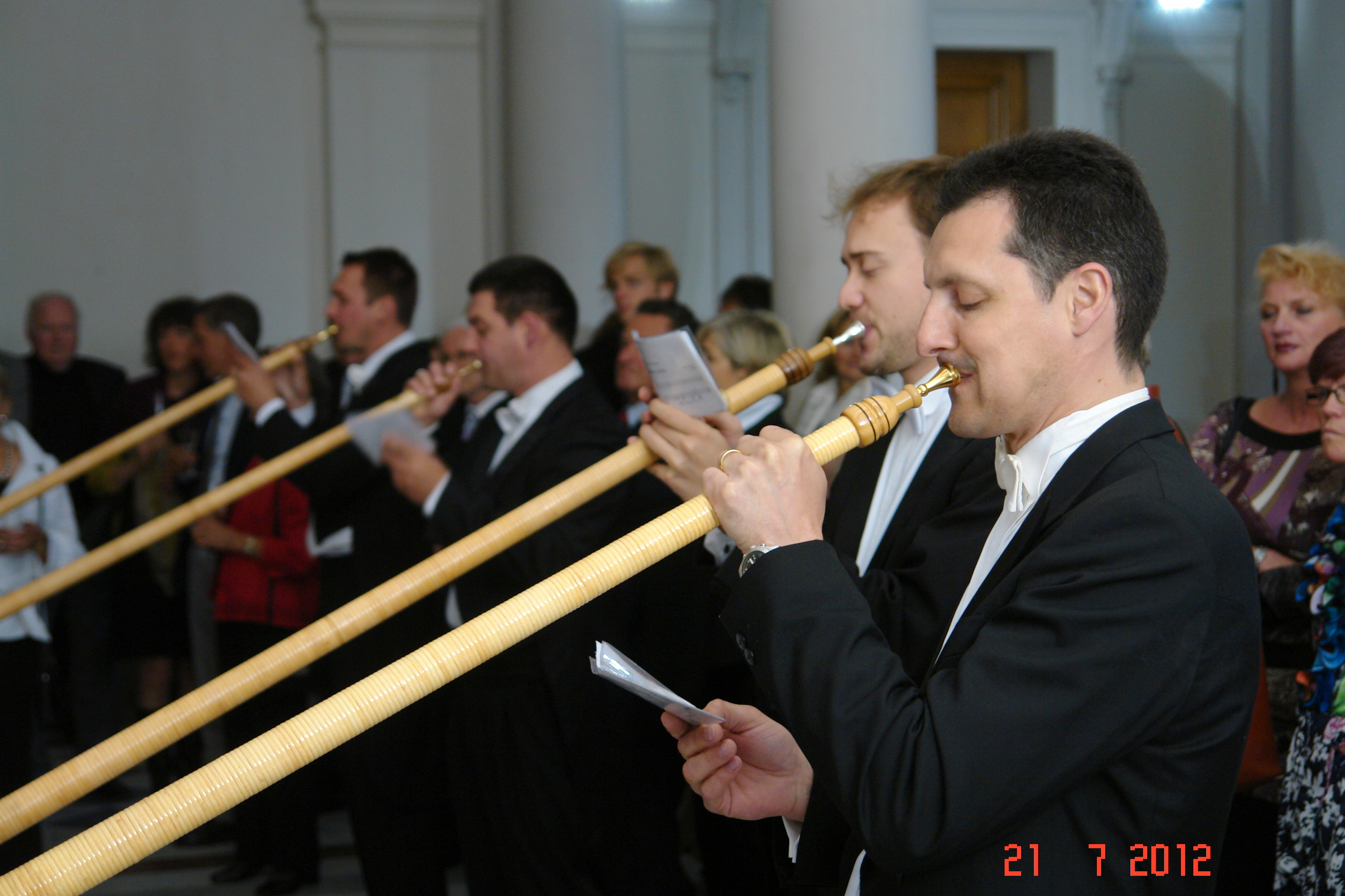The famous gong and alphorn players of Herrenchiemsee Festival have the task of signalling the start of concert (above and below).