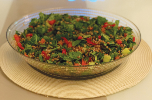 Tüm malzemeler küçük küçük doğrandıktan sonra haşlanan karabuğday doğranan malzemelerin üzerine ilave edilip karıştırılır. Sıcakken zeytinyağı ve limon sosunu koymanızı tavsiye ederim. Tercihe bağlı olarak limon yerine nar ekşisi de kullanabilirsiniz.