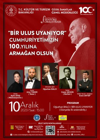 Bursa Bölge Devlet Senfoni Orkestrası bu hafta, besteleri ve düzenlemeleri Türkiye ve birçok ülkede, çeşitli orkestralar ve solistler tarafından seslendirilmekte olan, İstanbul Teknik Üniversitesi Türk Musikisi Devlet Konservatuarı Kompozisyon Bölümü Başkanı, orkestra şefi Oğuzhan Balcı yönetiminde, Uludağ İçecek tarafından kendisine sipariş edilen, metin yazarlığını birçok çalışmaya imza atmış, müzikolog, aynı zamanda eserde anlatan olarak sahne alacak olan Ersin Antep’in üstlendiği, Türkiye Cumhuriyeti’nin 100. yılına armağan edilmek üzere, ulu önder Mustafa Kemal Atatürk, tüm silah arkadaşları ve o dönemde vatanını korumak için canını hiçe sayan tüm Türk halkına duyulan şükran ve minnetle bestelenen Bir Ulus Uyanıyor eseriyle sahne alacak. Eser, Türkiye’de ve yurt dışında birçok başarıya imza atmış, ödüllü mezzo-soprano Aylin Ateş, İstanbul Devlet Opera ve Balesi solist sanatçısı, tenor Ufuk Toker ve ödüllü, İstanbul Devlet Opera ve Balesi solist sanatçısı, bariton Caner Akgün solistliğinde seslendirilecek.