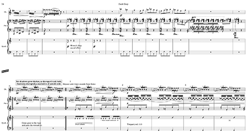 Eserde daha önce de bahsettiğim gibi hem varolan eserlere atıflar hem de benim yazdığım yeni eserler mevcuttu. Mavi bölümde Debussy ve Ravel’in sık kullandığı paralel tonlardaki gam ve arpejleriyle akarsu efektini verirken Yeşil bölümde bir orman imajı için Oliver Messiaen’in Kuşlar Kataloğu eserinden ses fikirleri alıyordum. Kırmızı bölümde yazılı müzikten ziyade yapısı oldukça sabit bir doğaçlama mevcuttu, amacımız bir zamanlar varolmuşların küllerinden ibaret bir dünya imajı yaratmaktı. Son bölümden sonra ışıklar kapanıyor ama eser bitmiyor, çünkü Sofia konser salonunun üst katının arkasından oldukça dokunaklı bir melodi çalıyor ve seyirci sadece bunun yankısını duyuyor, uzaktan gelen bir umut çağrısı gibi.