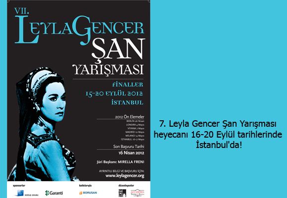 Opera dünyasına kazandırdığı genç yeteneklerle uluslararası müzik çevrelerinde adından övgüyle söz ettiren Leyla Gencer Şan Yarışması'nın final serisi, 16–20 Eylül tarihleri arasında gerçekleştirilecek. İKSV ve La Scala Akademisi tarafından hayata geçirilen Leyla Gencer Şan Yarışması'nın yedincisi, Doğuş Grubu ve Garanti Bankası'nın sponsorluğunda, Kültür ve Turizm Bakanlığı'nın desteği ve Borusan Holding'in katkılarıyla düzenlenecek. 7. Leyla Gencer Şan Yarışması'nın halka açık yarı finali 18 Eylül Salı günü 11.00'de Cemal Reşit Rey Konser Salonu'nda, finali ise 20 Eylül Perşembe akşamı 20.00'de Aya İrini Müzesi'nde gerçekleştirilecek.