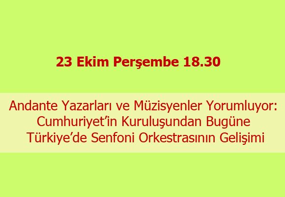 Senfoni Orkestrası, Türkiye'de Cumhuriyet'in ilan edilmesinden itibaren ciddiyetle ele alınan konulardan biri olmuştur. Atatürk'ün emriyle Ankara'ya taşınan Musika-i Hümayun zamanla bugünkü Cumhurbaşkanlığı Senfoni Orkestrası'na dönüşmüş, sonrasında yaşanan uzun süreli suskunluğun ardından diğer senfoni orkestraları zamanla devlet eliyle kurulmuştur. Türkiye 1990'lı yılların ikinci yarısından itibaren de özel sektör tarafından kurulan senfoni orkestralarıyla tanışmıştır. Etkinlikte, Türkiye'nin bu alanda 100 yıla yakın bir süredir sergilemekte olduğu performans değerlendiriliyor, artıları ve eksileriyle Türkiye'de bir senfoni orkestrası geleneğinin oluşup oluşmadığı inceleniyor.