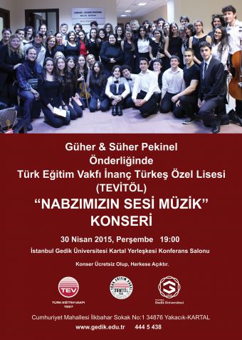 TEVİTÖL Güher & Süher Pekinel Müzik Bölümü’nde okuyan toplam 278 öğrenciden, bu kez 32 öğrencinin sahne alacağı "Nabzımızın Sesi Müzik" konseri 30 Nisan 2015 tarihinde, saat 19:00’da Gedik Üniversitesi’nde gerçekleşecek.