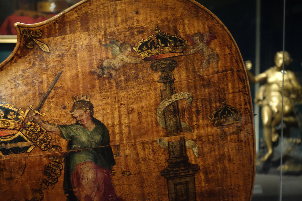 Fransa Kralı 9. Charles'ın sarayında icra edilmesi için sipariş edilen çellonun üzerinde, kralı yücelten çizimler de bulunuyor. Kılıç, taç gibi ögelerin yanında, dini figür olarak çizilen melekler de dikkat çeken ayrıntılar arasında göze çarpıyor.