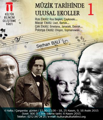1996 yılında FEST Travel bünyesinde başlatılan ve 2002’de Kültür Bilincini Geliştirme Vakfı'na devredilen Tarih, Arkeoloji ve Sanat Seminerleri 2015-2016 Sonbahar-Kış programıyla yine dopdolu. Budizm’den İran’a ve Bitki Dünyasının sırlarına uzanan zengin eğitim takviminin konu başlıklarından biri de “Müzik Tarihinde Ulusal Ekoller”. Andante klasik müzik dergisi genel yayın yönetmeni Serhan Bali tarafından verilecek bu seminerlerin ilk kuru 18, 25 Kasım ve 9, 16 Aralık 2015 Çarşamba günleri saat 11:00-13:00 arası, ikinci kuru ise 6, 13, 27 Ocak Çarşamba günleri 11:00-13:00 arasında gerçekleşecek. İlk kurun son ödeme tarihi 6 Kasım 2015, ikinci kurun ise 25 Aralık 2015 olup, katılım ücreti ilk kur için 400 TL, ikinci kur içinse 300 TL olarak belirlenmiştir.